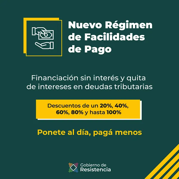 Resistencia anunció un nuevo régimen de pago de impuestos para los vecinos y vecinas que tengan deudas municipales. La moratoria permite saldar y/o acortar compromisos tributarios a valor nominal, sin intereses, en cuotas y con importantes descuentos con plazo hasta el 31 de diciembre.