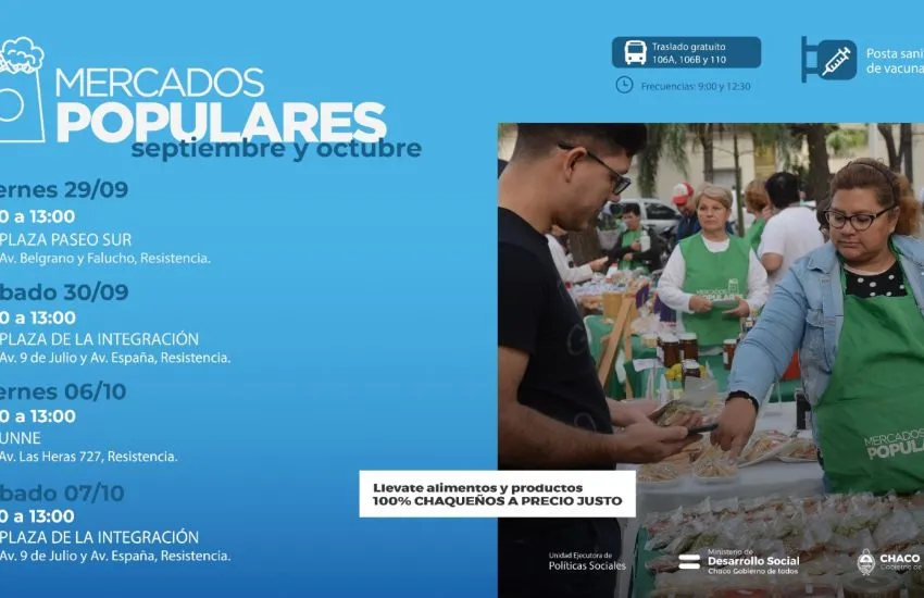 El Ministerio de Desarrollo Social informa que durante este último fin de semana de septiembre y el primero de octubre continuarán los Mercados Populares en Resistencia. Se trata de operativos de comercialización de alimentos frescos, producciones y artesanías confeccionadas por emprendedoras, emprendedores y unidades productivas chaqueñas, a precios accesibles.