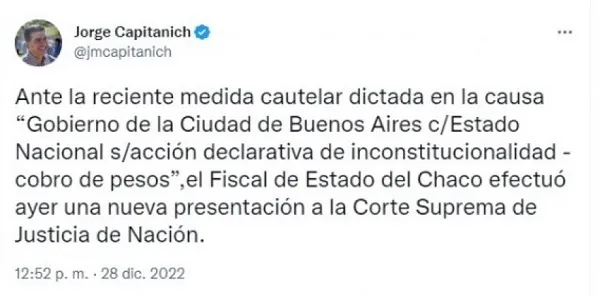 El gobernador de Chaco, Jorge Capitanich, informó que la provincia sumó este miércoles su pedido ante la Corte Suprema de Justicia para constituirse como “amicus curiae” en el litigio entre Nación y la Ciudad de Buenos Aires por los recursos coparticipables.