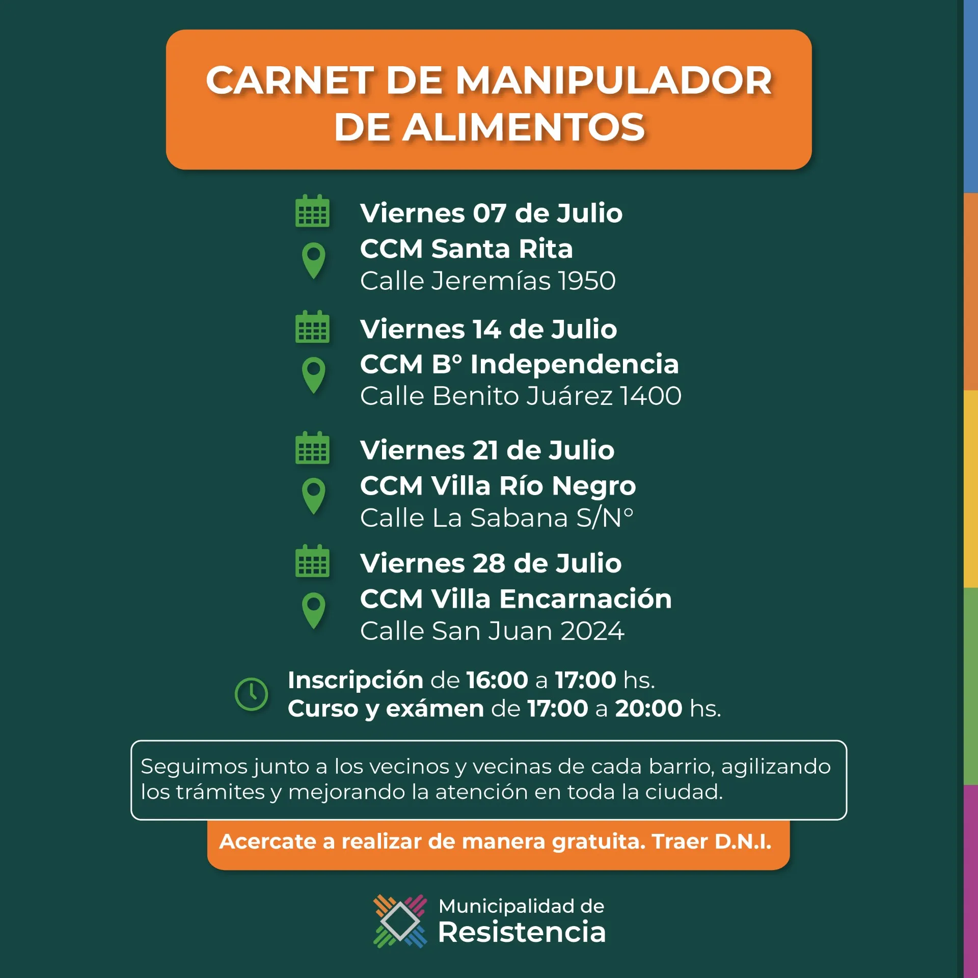 El inicio del séptimo mes del año generó que el Municipio de Resistencia anuncie un nuevo cronograma del trámite, libre y gratuito, que se debe realizar para obtener el carnet habilitante obligatorio para todas aquellas personas que se desempeñen en tareas donde estén en contacto con comestibles. La primera jornada tendrá lugar este viernes 7 de julio en el Centro Comunitario Municipal del Barrio Santa Rita, sito en calle Jeremías al 1950.