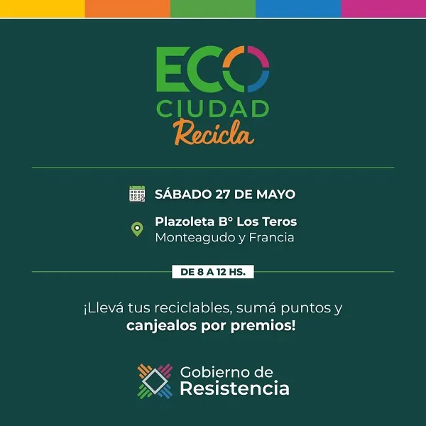 Este sábado 27 de mayo, el programa ambiental municipal “Eco Ciudad Recicla” se presentará en la plazoleta del barrio “Los Teros”, sita en la esquina de calles Monteagudo y Francia, a partir de 8 y hasta las 12 horas. Se recibirán los residuos sólidos reciclables que aporten las instituciones, a fin de sumar puntos que los puedan canjear por elementos deportivos y otros premios para las actividades que realizan.Cabe señalar que este programa recibe cuatro tipos de materiales: plásticos PET, aluminio, cartón y vidrio, teniendo como destinatarias instituciones, organizaciones educativas, deportivas, culturales y barriales, comedores y merenderos comunitarios.Eco Ciudad Recicla es un programa de “Salud Ambiental y Ciudadanía” y forma parte de la estructura de planificación que implementa la subsecretaría de Ambiente del municipio de Resistencia.