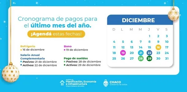 El Ministerio de Planificación, Economía e Infraestructura recordó que este martes y miércoles se abonará el aguinaldo a jubiladas y jubilados y a trabajadoras y trabajadores activos de la Administración Pública, continuando con el cronograma de pagos que había sido anunciado por el gobernador Jorge Capitanich.