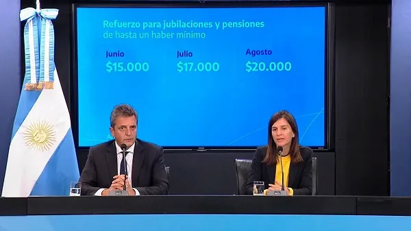 El ministro de Economía, Sergio Massa, y la directora ejecutiva de Anses, Fernanda Raverta, anunciaron un aumento de 20,92% correspondiente a la Ley de Movilidad y un refuerzo para las jubilaciones y pensiones mínimas de $15.000 en junio, $17.000 en julio y $20.000 en agosto.