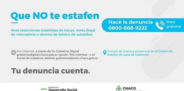 Para el caso de transferencias sociales, las y los denunciantes deben dirigirse personalmente al Área Becas del Ministerio de Desarrollo Social, en avenida Marconi Nº 560 de Resistencia, o bien pueden comunicarse por correo electrónico [email protected], teléfono 362-4220015.