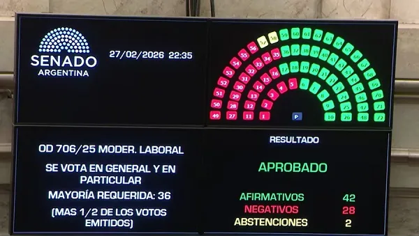 La Libertad Avanza (LLA) finalizó las sesiones extraordinarias este viernes en el Senado, con una consagración para el Gobierno de Javier Milei e inevitables consecuencias a medirse en el mediano plazo: la Cámara alta sancionó la ley de reforma laboral, tras la validación de la modificación al proyecto realizada la semana pasada por Diputados, que eliminó el conflictivo artículo sobre licencias médicas. Entre el oficialismo y dialoguistas como la Unión Cívica Radical (UCR), el PRO, peronistas disidentes y silvestres provinciales, la iniciativa obtuvo esta noche 42 votos a favor, mientras que 28 fueron en contra y se abstuvieron los santacruceños José María Carambia y Natalia Gadano, tras cuatro horas de debate.