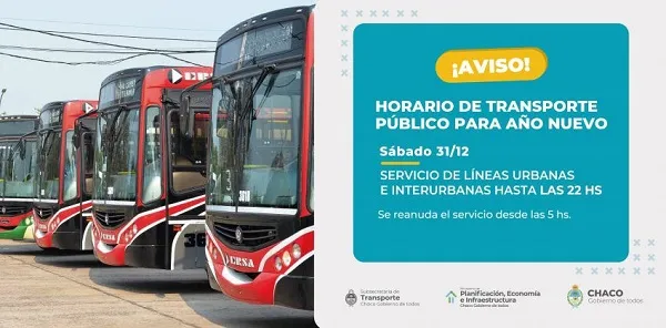 Desde la subsecretaría de Transporte, dependiente del ministerio de Planificación, Economía e Infraestructura, detallaron que el servicio de transporte público de pasajeros se reducirá debido a los festejos de fin de año. Las líneas urbanas e interurbanas del área metropolitana del Gran Resistencia estarán disponibles hasta las 22 del sábado 31 de diciembre y retomarán los servicios el domingo 1 de enero a las 5.