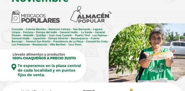 Miércoles 16, 23, 30: Mercados Populares en Fontana (8 a 11:30), Presidencia de la Plaza (8:00 a 11:30), y Quitilipi (solo 23 y 30 de noviembre, de 8:00 a 12:00), el 30 también en Puerto Tirol (16:00 a 19:00), más Almacenes Populares en Charata (8:00 a 13:00), y en Puerto Bermejo (9:00 a 12:00 y 15:00 a 20:00).