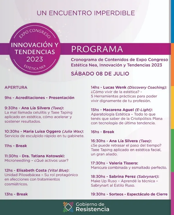 El programa previsto se inicia a las 9 con las acreditaciones y la presentación del evento. Para las 9,30 se dispuso el inicio de la primera disertación con Ana Lía Silvera con su tema “La mal llamada celulitis, TaeeTaping Aplicado a la Estética; cómo acelerar y sostener resultados”.