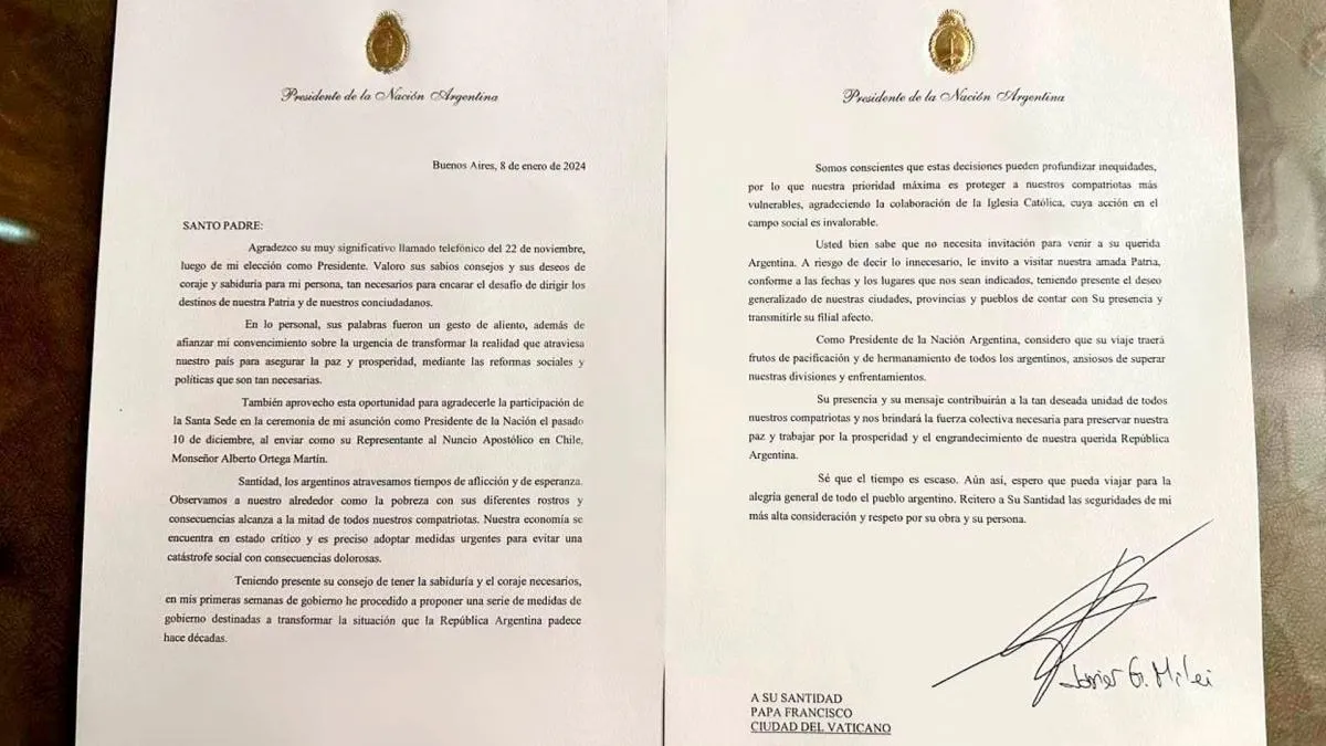 El presidente Milei invitó oficialmente al papa Francisco a visitar la Argentina. La invitación la firmó de puño y letra el propio mandatario y será enviada por canales diplomáticos al Vaticano en las próximas horas. “Sería una buena oportunidad para cerrar algunas diferencias”, dijo.