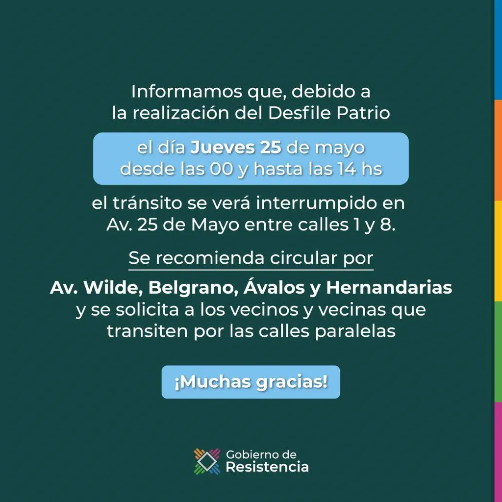 Resistencia informa que este jueves 25 de mayo, debido a la realización de los actos por el 213º aniversario de la Revolución de Mayo, habrá interrupción del tránsito en algunas arterias de la ciudad donde se llevará a cabo el desfile cívico militar. Desde las 0 y hasta las 14 horas no se podrá transitar por la avenida 25 de Mayo, desde Ávalos hasta Mac Lean/Coronel Falcón.