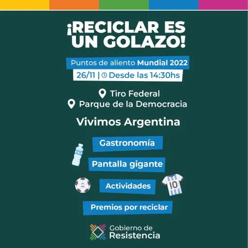 El gobierno de Resistencia invita a las familias a sumarse este sábado 26, desde las 14:30, en el Parque Urbano Tiro Federal y en el Parque de la Democracia para alentar y disfrutar del Mundial de Fútbol, donde además se podrán canjear premios por reciclables.