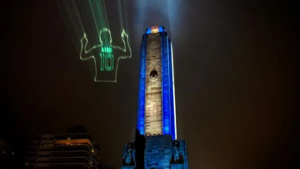 El Monumento a la Bandera apareció iluminado con los colores celeste y blanco, mientras la imagen del capitán del seleccionado argentino se reflejaba en el cielo.