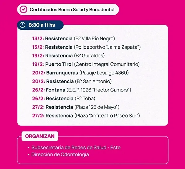 Para realizar los Certificados de Buena Salud y Bucodental, de 8:30 a 11 hs, se fijaron los siguientes lugares: