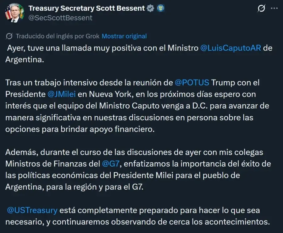 “Después de un intenso trabajo desde la reunión del presidente Donald Trump con el Presidente Javier Milei en Nueva York, en los próximos días espero que el equipo del Ministro Caputo venga a DC para avanzar significativamente en nuestras discusiones en persona sobre las opciones para brindar apoyo financiero”, indicó Bessent en una comunicación a través de redes sociales.
