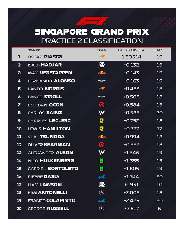 El inicio del Gran Premio de Singapur de la Fórmula 1 no fue el esperado para Franco Colapinto. En el siempre exigente trazado urbano de Marina Bay, el argentino padeció los problemas de rendimiento de su Alpine y terminó lejos de los tiempos de punta en las dos sesiones de entrenamientos libres. En la segunda tanda, la más representativa de cara a la clasificación, apenas pudo ubicarse 19°, superando únicamente al accidentado George Russell.